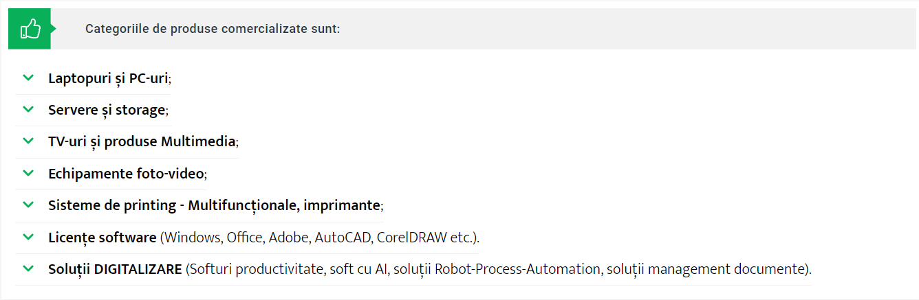 Furnizăm produse și echipamente IT de înaltă performanță și fiabilitate, la cel mai bun raport preț/calitate, de la branduri IT de renume: Apple, Dell, HP, Lenovo,Acer, Asus, Toshiba, Synology, Xerox, Fujitsu, Nikon, Canon, etc.